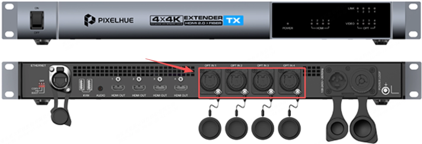 Up to four 4k images can be output The two optical ports in each row are spliced left and right to form a 4k