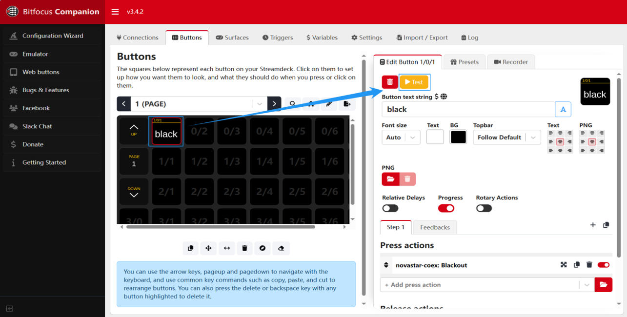 7)After editing, the button will display its custom name and function as shown in the diagram. With proper communication between Companion and the device confirmed, click "TEST" to verify button functionality, completing the button setup process.
