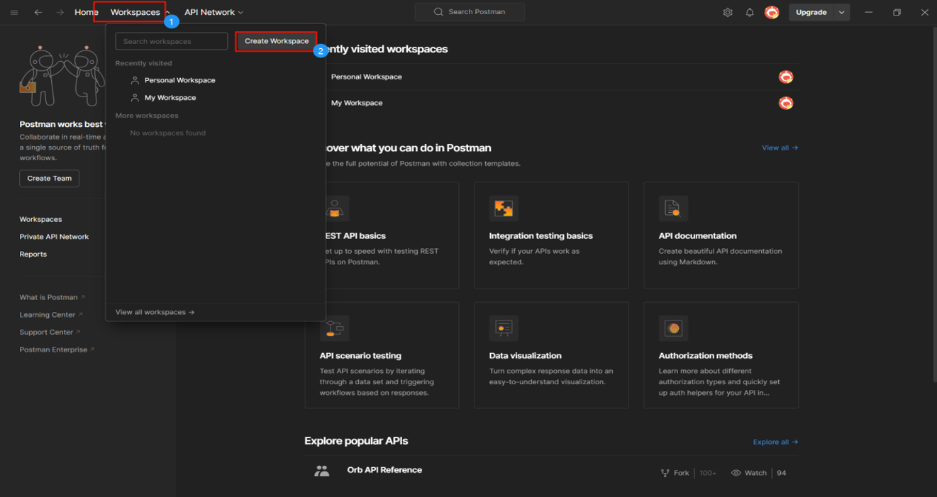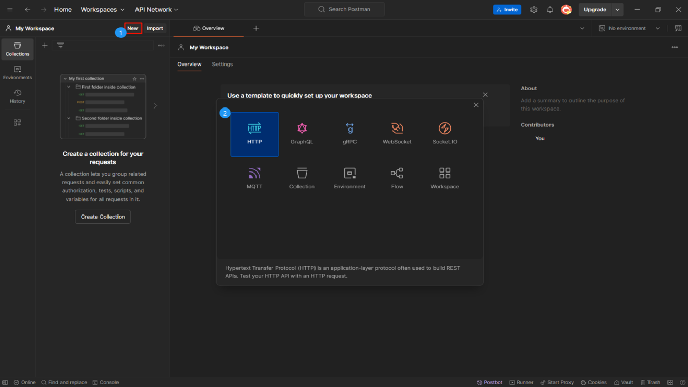 3. As needed, create new requests, collections, or environments. You can also directly import collections or environments, such as from files, folders, links, or by pasting raw text. The image below shows creating a new HTTP request.