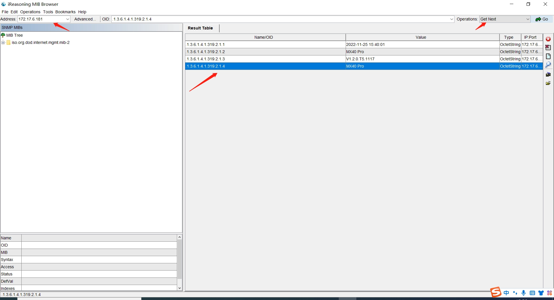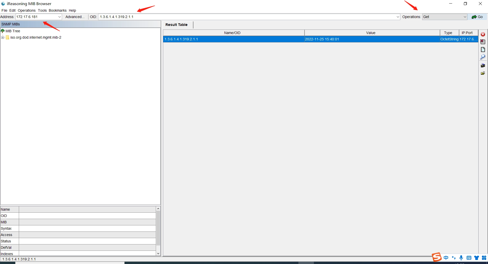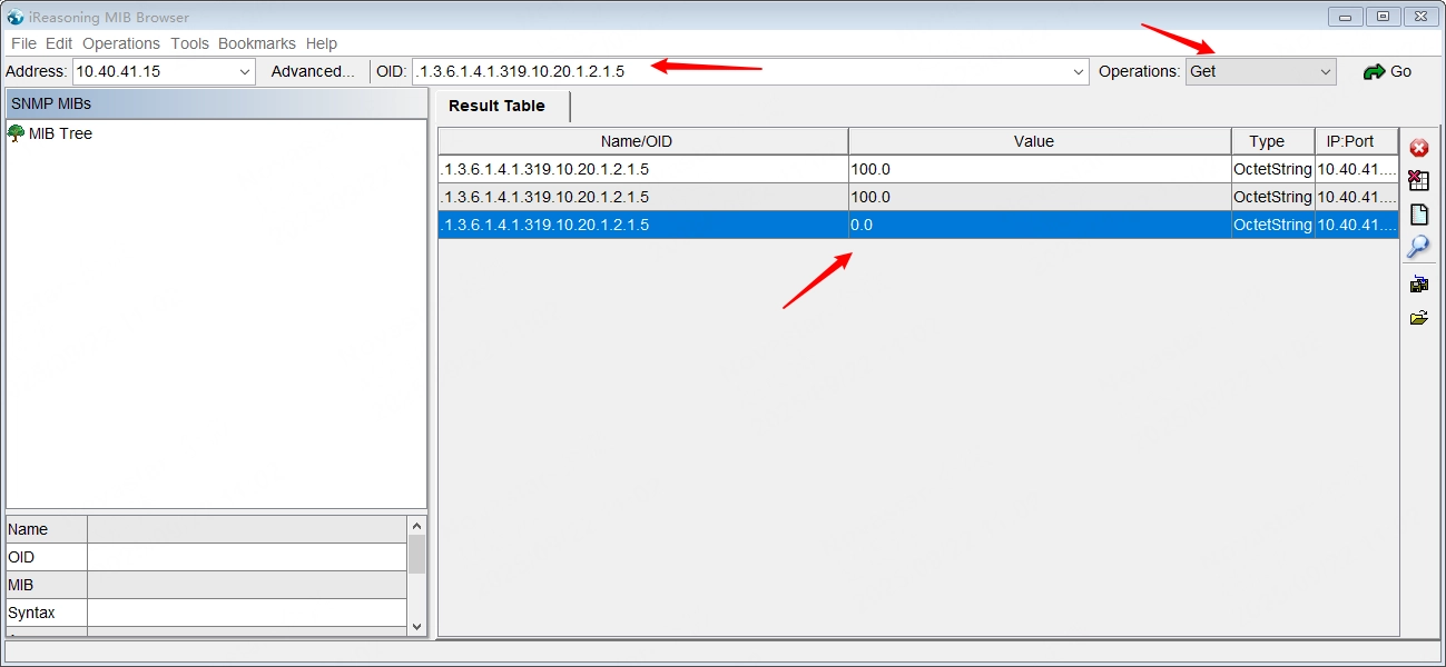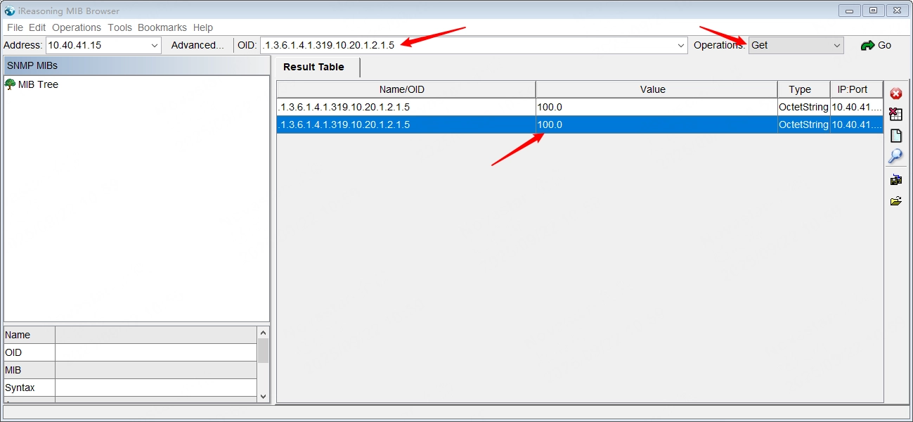 By following the arrows in the figure below in order, fill in the correct device IP address and the OID corresponding to the monitoring item information in the picture, select Get in the Operations drop-down list, and finally click the Go button to complete the operation of getting the monitoring item information by Get.