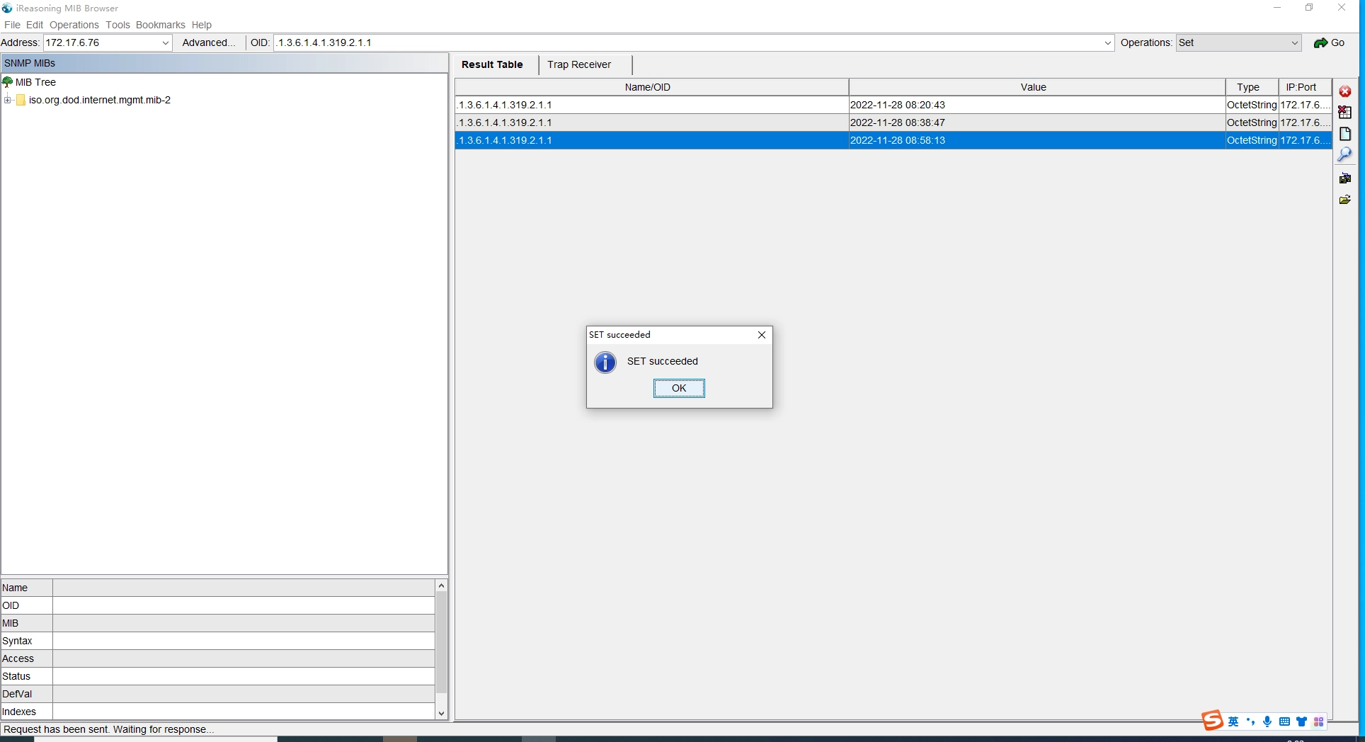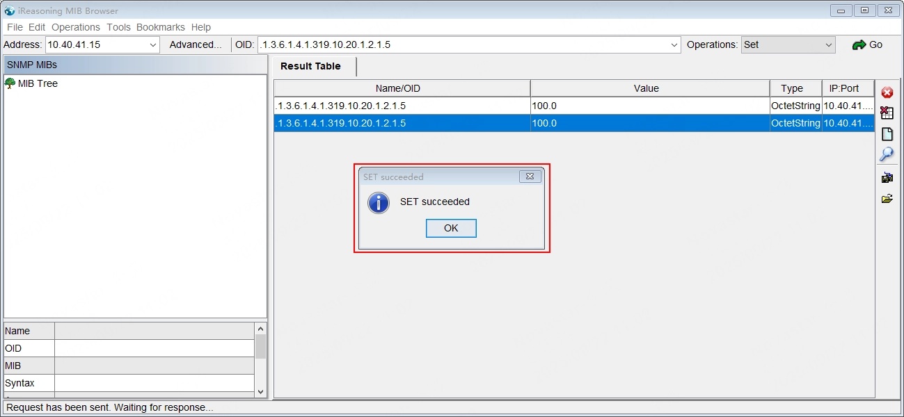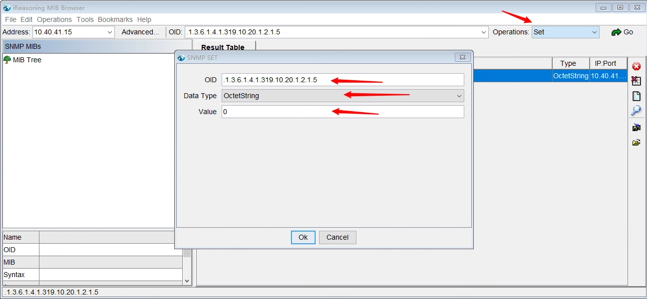 Fill in the correct device IP address and the OID corresponding to the monitoring item information at the top of the page, select Set in the Operations drop-down list and Click the Go button.