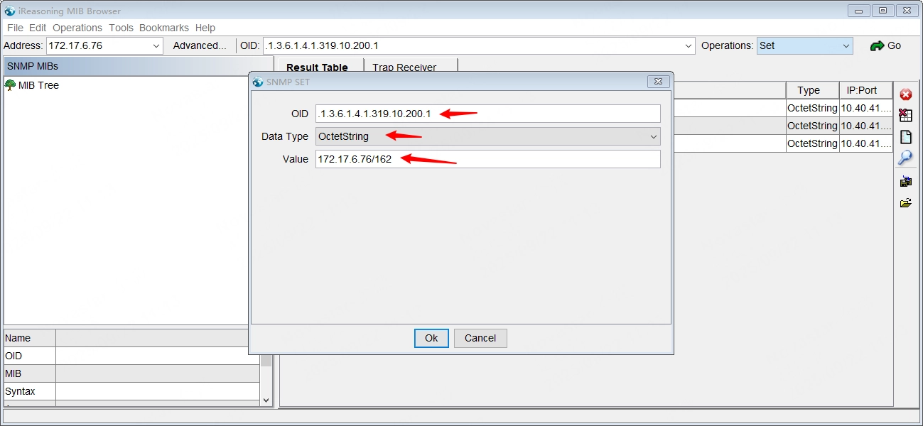 In the OID input box of the pop-up SNMP SET edit area, fill in 1.3.6.1.4.1.319.10.200.1, select the corresponding type OctetString of the parameter to be sent in the Data Type drop-down list, and fill in the parameter value 172.17.6.179/162 in the Value input box (recommended port: 162).