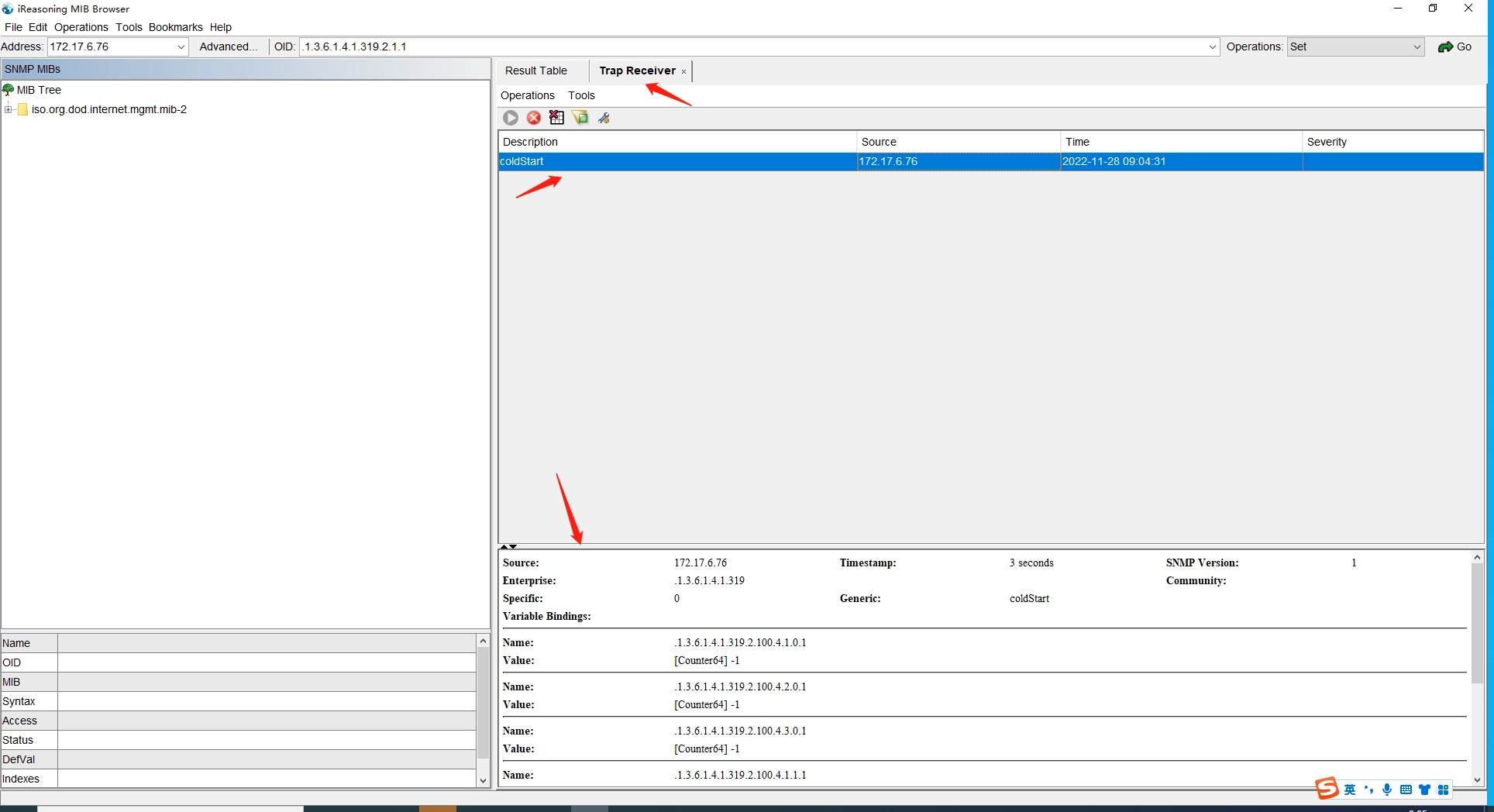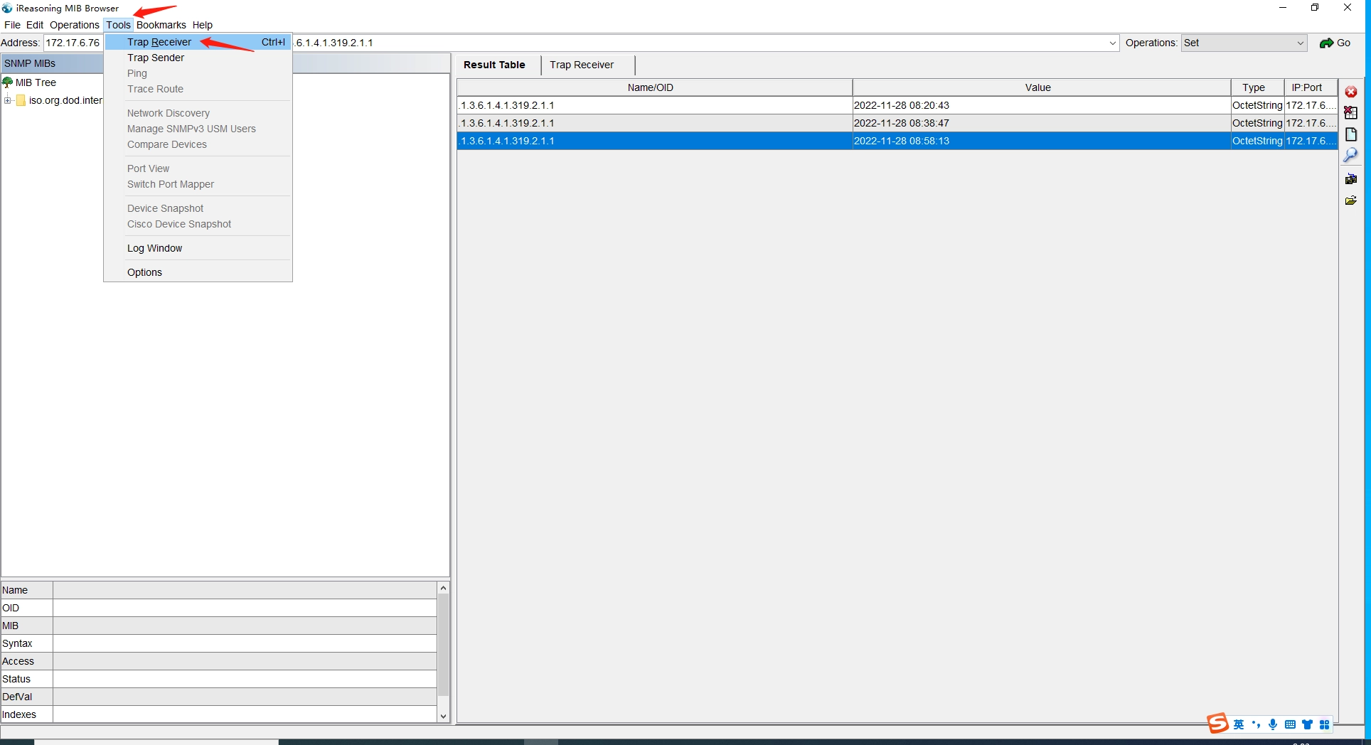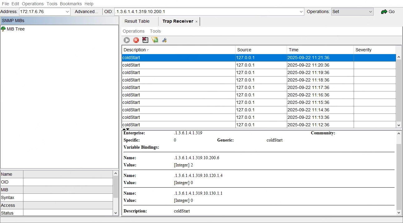 The execution results are displayed in the Trap Receiver area, as shown in the figure. Detailed information can be viewed in the details display area below by clicking on the specific entry in the Description.