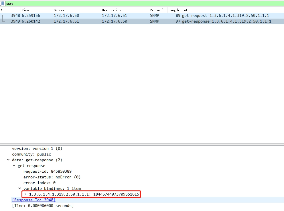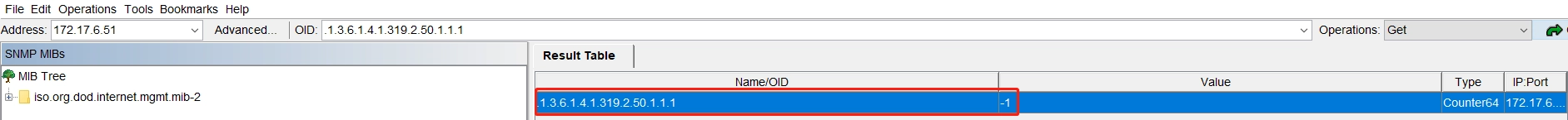 Example 2 (Software limitation, unsupported uint64 display): When testing the connection status of receiving cards 1-64 under Ethernet port 1, the value obtained is -1. The MIB software will treat the highest bit as a symbolic bit and all Get or Trap data in int64 type will be in this situation. At this time, use wireshark to capture packet for test: